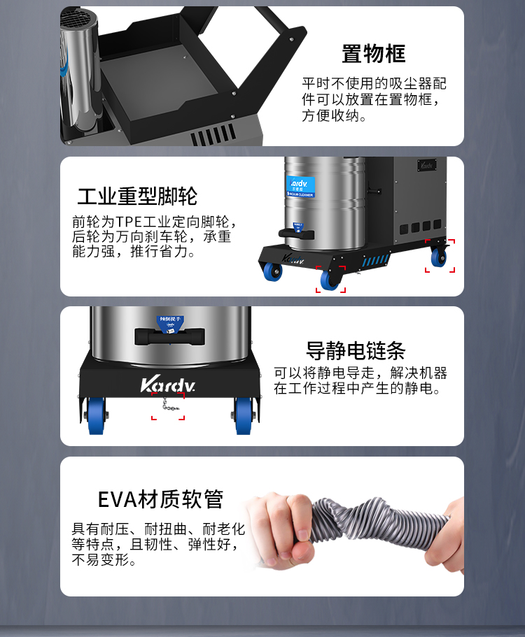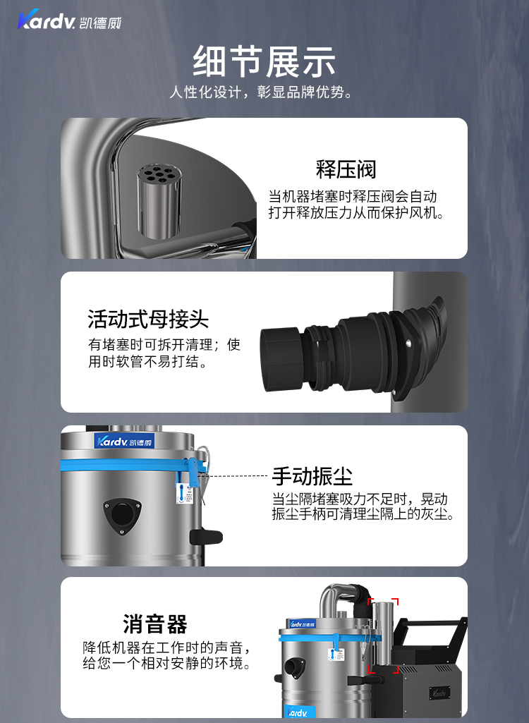 SK-710是一款自主研發(fā)的工業(yè)吸塵器。采用工業(yè)設(shè)計(jì)風(fēng)格,做工精美,外觀大氣,黑灰色調(diào)搭配彰顯本機(jī)的工業(yè)風(fēng)格。電控系統(tǒng)采用簡單易操作的按鍵式控制系統(tǒng),有防缺相,漏電,過載的保護(hù)。動力源采用凱德威FY4.0定制主機(jī),葉片以及外殼為合金材料壓鑄成型,再經(jīng)過整體拋光噴涂,相對控制了整機(jī)的熱脹冷縮,風(fēng)量穩(wěn)定,并選用了質(zhì)量穩(wěn)定的軸承。