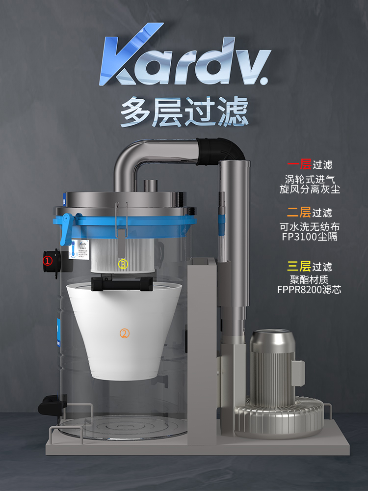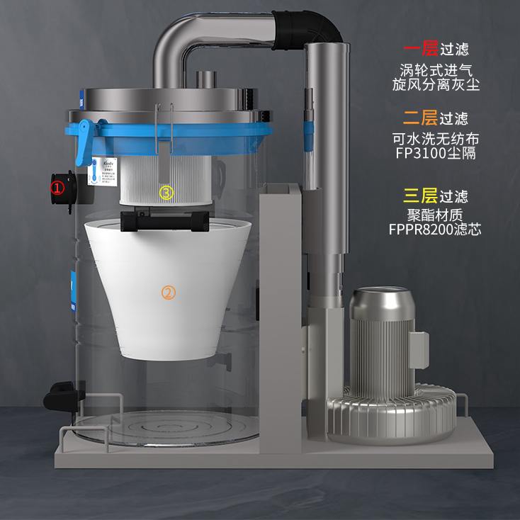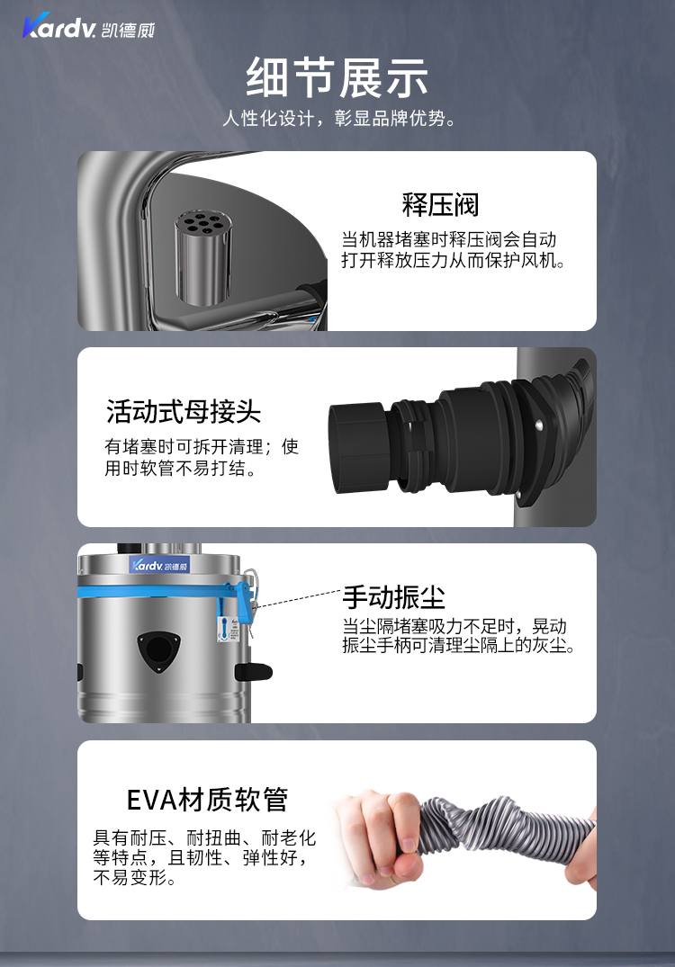 SK-510是一款工業(yè)吸塵器,整機采用工業(yè)設(shè)計風格,美觀硬朗,結(jié)構(gòu)緊湊。機器集塵桶采用不銹鋼制作,桶壁光滑易清理;配有晃動振塵、泄壓閥。
