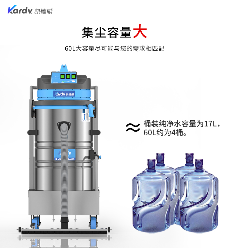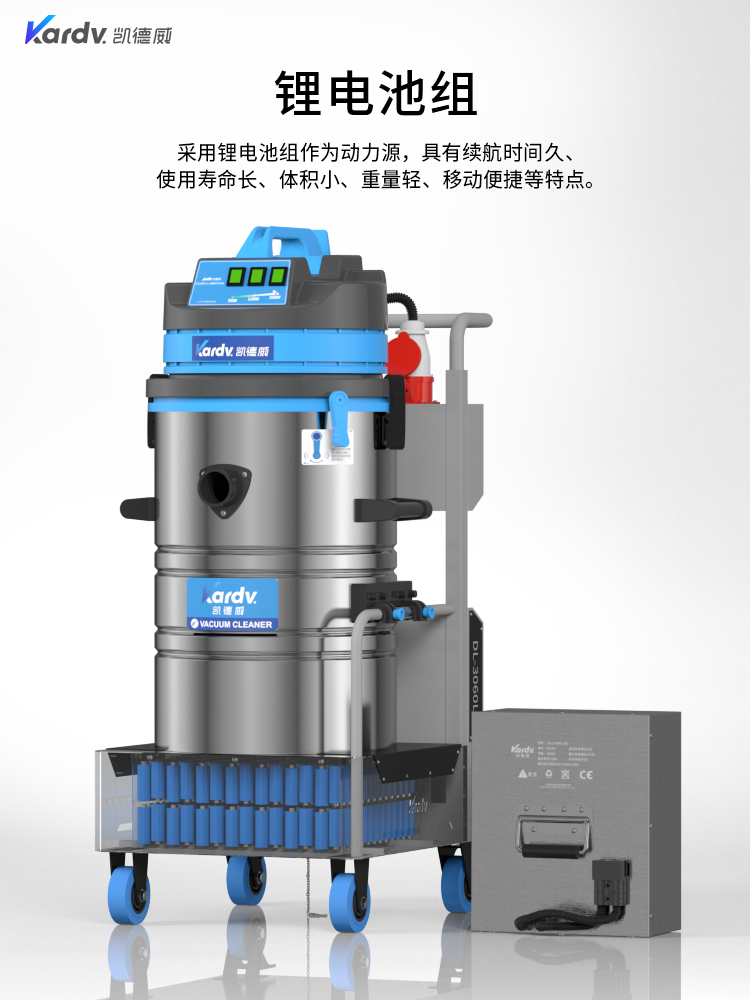 DL-3060L凱德威鋰電池吸塵器是我司的一款充電式工業(yè)吸塵器,摒棄了常規(guī)拖線式吸塵器使用范圍的局限性。此款吸塵器利用鋰電池組做為電力源,不需外接電源,操作簡單方便。體積小,重量輕,移動便捷,續(xù)航時間久,隨充隨用,簡單方便。機(jī)器除常規(guī)手持式吸塵外,裝置有60cm寬可推吸扒頭,可以邊推邊吸。
