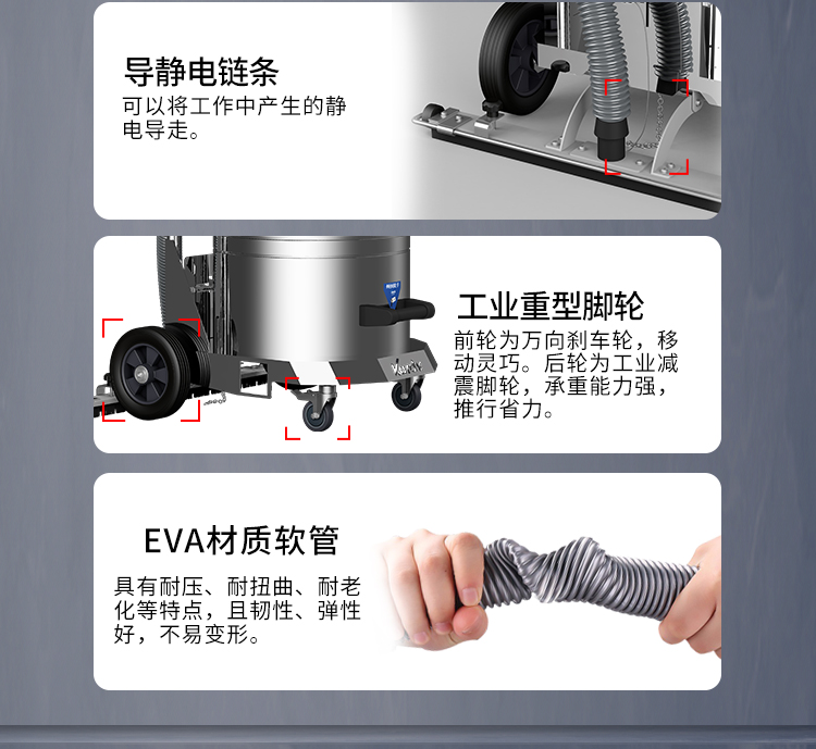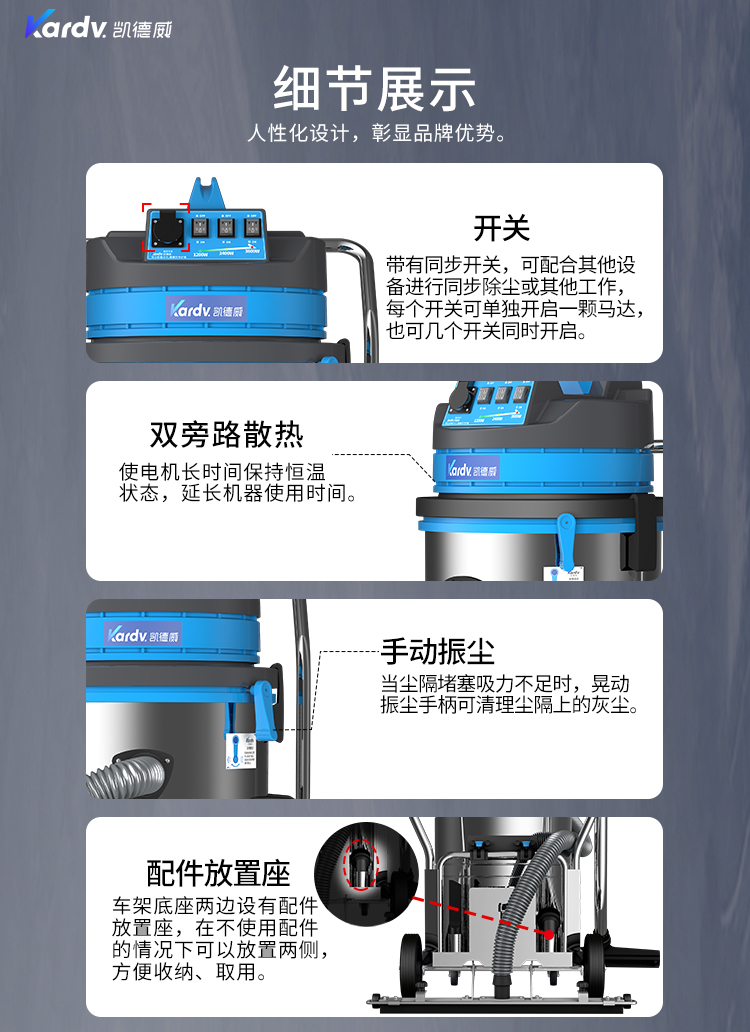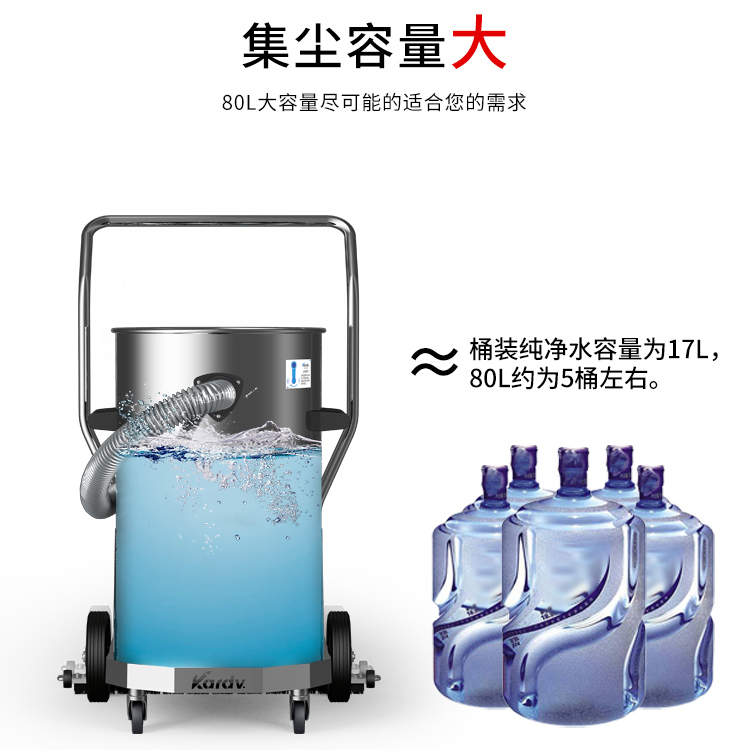 DL-3078P是一款工商業(yè)吸塵器,有3顆馬達(dá),可單獨(dú)或聯(lián)合開啟;集塵桶為80L,為不銹鋼材質(zhì),配有不銹鋼車架,在移動(dòng)時(shí)輕巧方便;配有手動(dòng)晃動(dòng)振塵,在使用的過程中,左右晃動(dòng)振塵手柄就可以起到清理過濾器的作用;配有60cm寬的推吸扒頭,可以邊推邊吸??梢杂迷诠S、倉(cāng)庫(kù)等場(chǎng)所清理灰塵等,在商業(yè)環(huán)境中也可以使用。