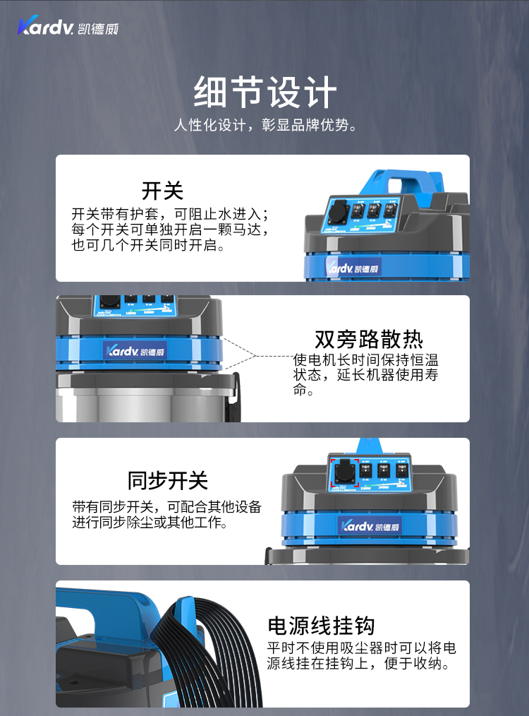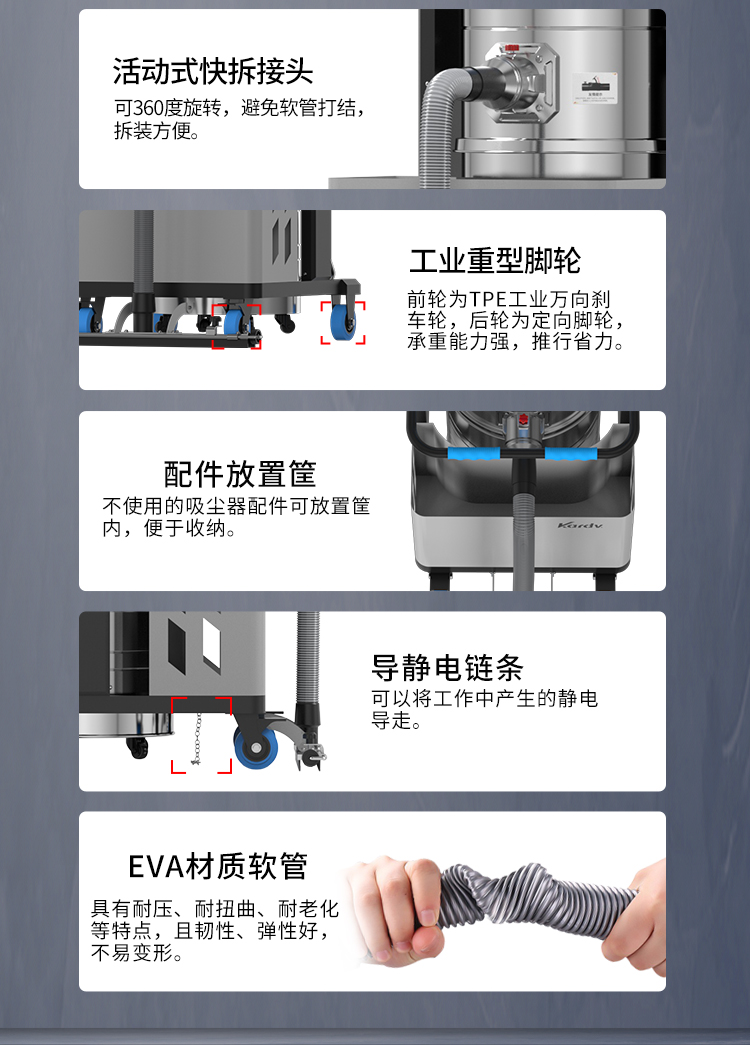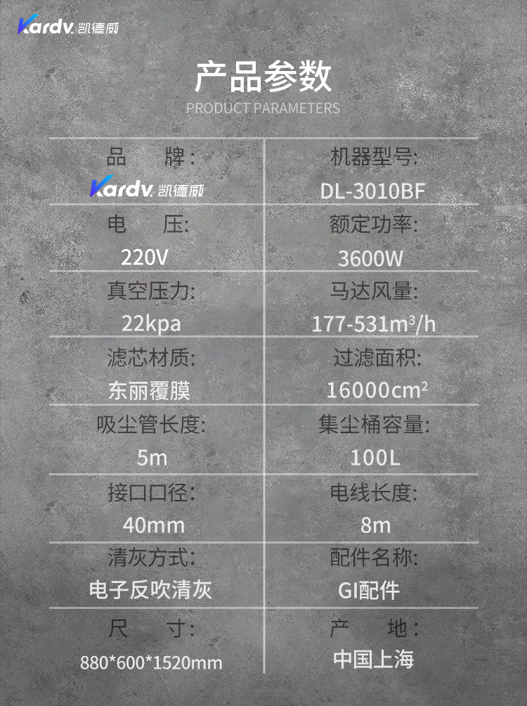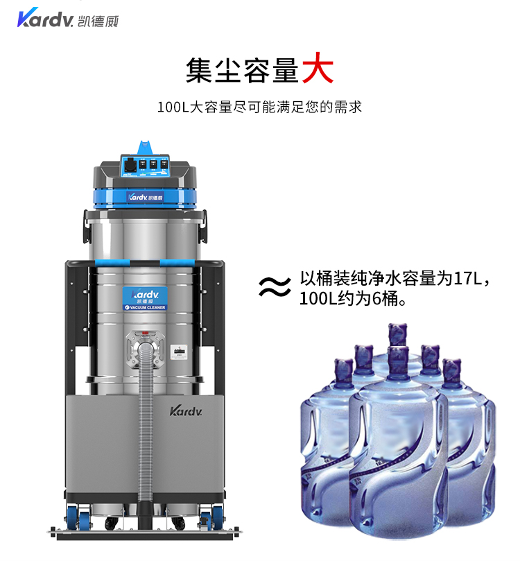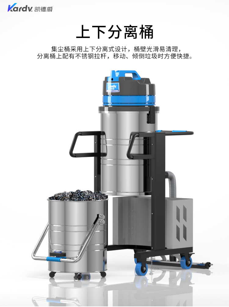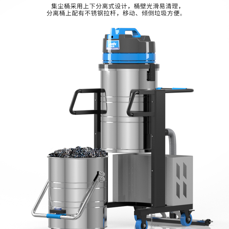 DL-3010BF是一款干濕兩用型工商業(yè)吸塵器,電壓220v,有3顆馬達(dá)組成,每個(gè)馬達(dá)1200w功率,合計(jì)功率360W,帶一套40口徑GI配件和一套60公分寬的推吸扒頭,工作直徑32米左右??筛鶕?jù)不同工況選擇單獨(dú)開(kāi)一個(gè)電機(jī)或兩個(gè)/三個(gè)同時(shí)開(kāi),100L不銹鋼集塵桶采用上下分離式設(shè)計(jì),桶壁光滑易清理,分離桶上配有不銹鋼拉桿,移動(dòng)、傾倒垃圾時(shí)方便;配有反吹清灰裝置,當(dāng)吸力不足時(shí),可按下反吹手柄幾秒進(jìn)行反吹清理。機(jī)器配有置物框,便于收納配件。機(jī)器可以邊推邊吸。適用于五金、食品、電機(jī)、機(jī)械、化工等工商