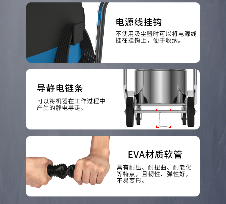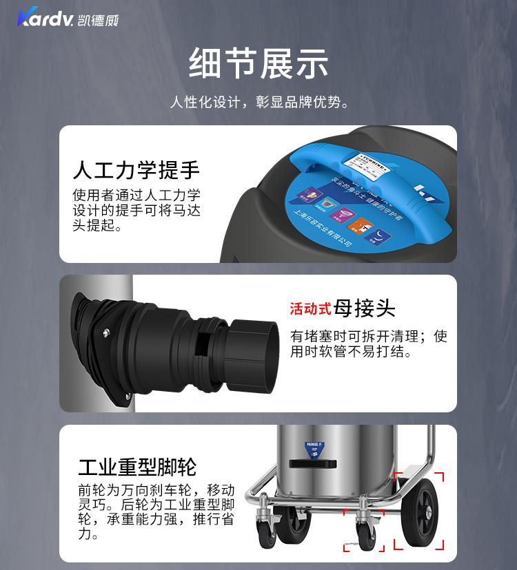 DL-1245是一款干濕兩用型吸塵器,集塵桶為45L不銹鋼材質(zhì);散熱上采用上下氣道分離設計;配有置物架,可以防止工具和配件,方便使用;可以用在倉庫、廠房等;也可與其它產(chǎn)品配套使用,也可用作將廢料收集;也可使用在普通的商業(yè)、企業(yè)環(huán)境,比如一般的辦公室、客房等。